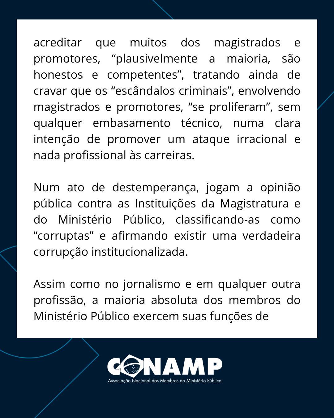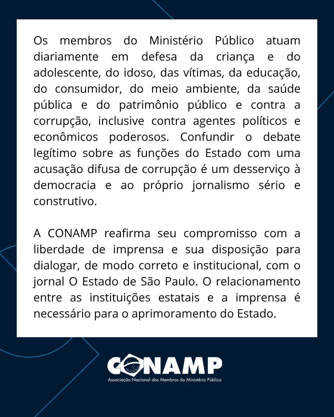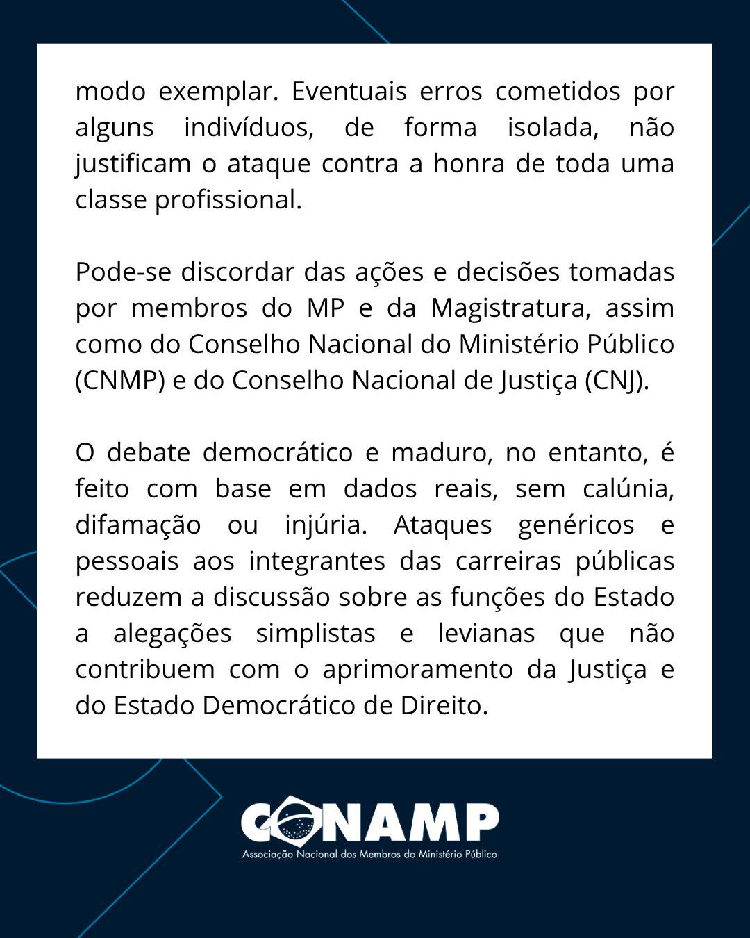 A manifestação reafirma o compromisso dos membros do Ministério Público com a defesa da sociedade, da ordem jurídica e do Estado Democrático de Direito, destacando a importância de um debate público responsável, baseado em dados concretos e no respeito às instituições.